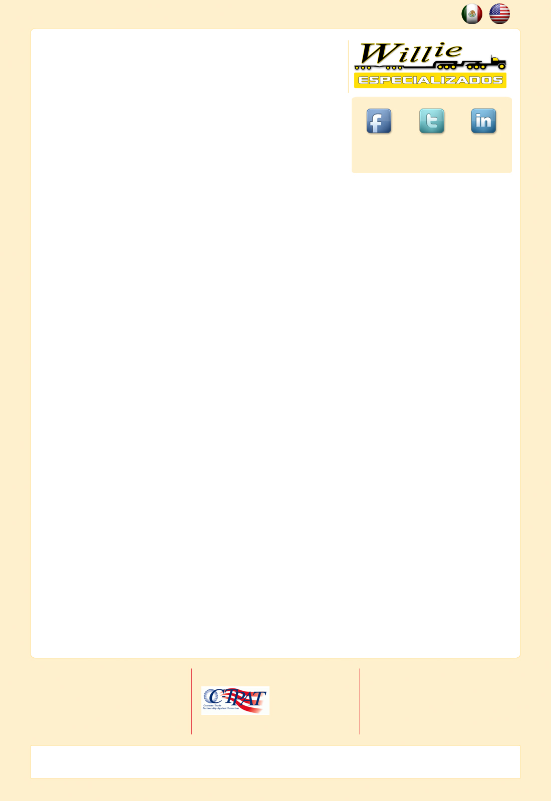 Especializados “Willie” es una empresa internacional que cuenta con más de 15 años de experiencia en la industria de servicios de transporte especializado y maniobras de piezas indivisibles. A lo largo de sus años, la empresa ha mostrado y cumplido satisfactoriamente con las necesidades de sus clientes, manteniendo en cada una de sus maniobras un alto estándar de calidad.
